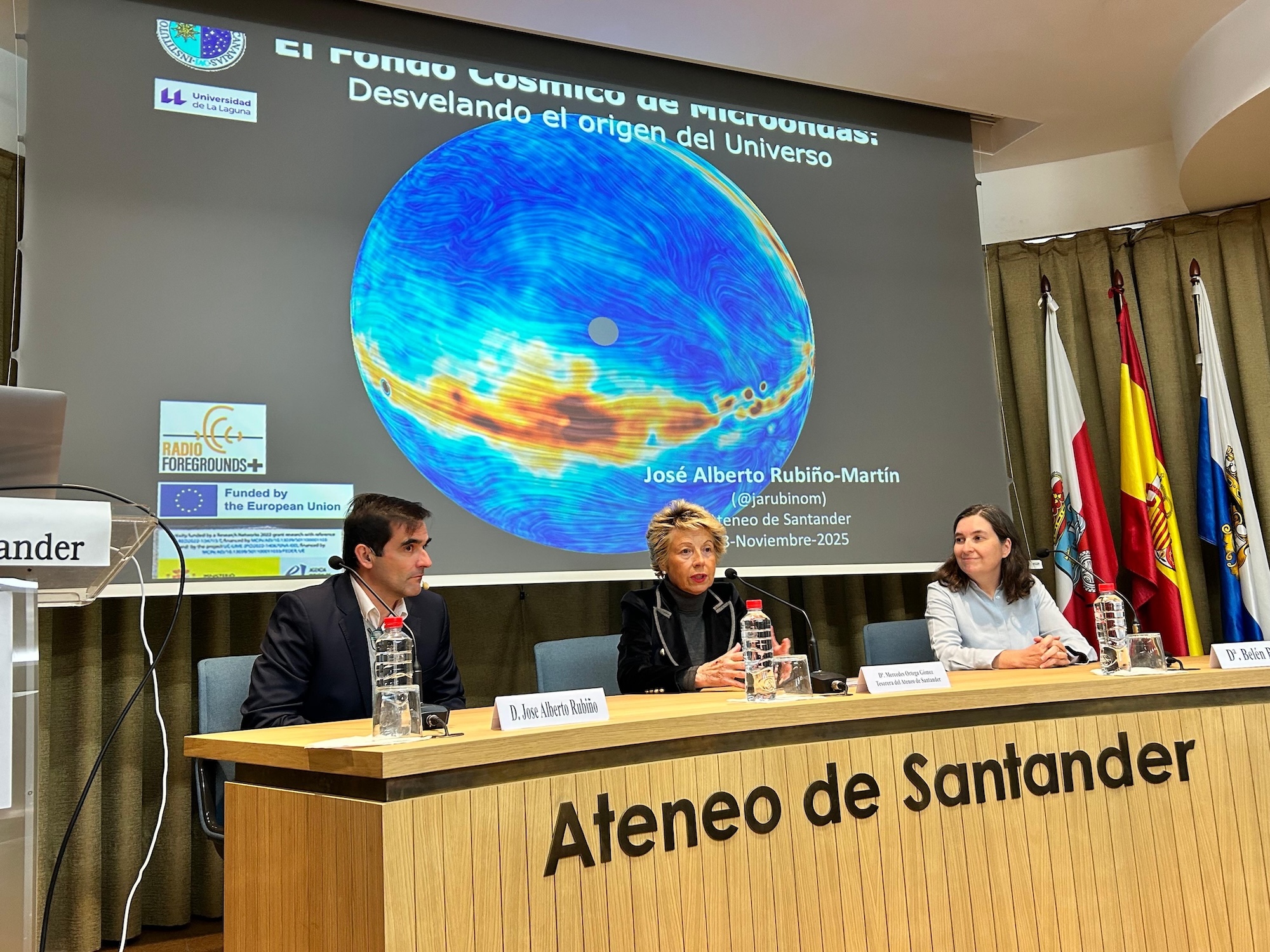 Como parte de las actividades del congreso, el 18 de noviembre a las 19:30 tuvo lugar en el Ateneo de Santander la charla titulada “El Fondo Cósmico de Microondas: desvelando el origen del universo", impartida por José Alberto Rubiño, del Instituto de Astrofísica de Canarias (IAC). Según señala el propio Rubiño, “la charla ofreció una perspectiva sobre la luz más antigua del universo y cómo esta permite estudiar la evolución cósmica". Además, explicó los enigmas de la cosmología actual y cómo la nueva generación de instrumentos que mide la radiación cósmica ayudará a resolver estas preguntas fundamentales.